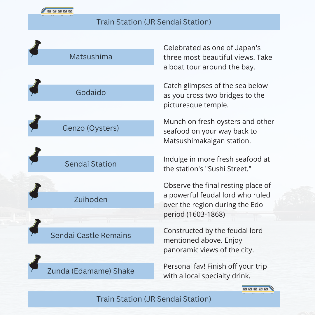 To fully immerse yourself in Sendai's culture, history, and natural beauty, consider this itinerary as a guide. Note you'll need to take a train from Sendai Station to Matsushimakaigan Station to visit the first three items.